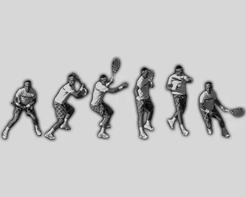 Nadal sets himself up with flexion: His ankles are dorsi-flexed (when his toe rises up) tensing his calves; his knees bend, putting his quadriceps into a stretch. His glutes activate due to flexion of his hips. He is in a position to prepare for explosive force production in the upcoming shot.